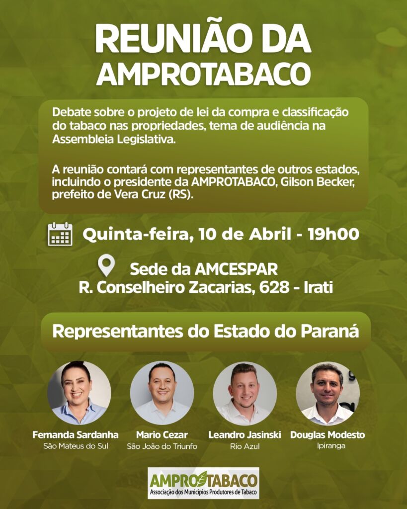 Reunião da AMPROTABACO é remarcada para o dia 10 de abril em Irati Por CLAYTON BURGATH Postado em 8 de abril de 2025 0 A importante reunião da AMPROTABACO (Associação dos Municípios Produtores de Tabaco), que estava inicialmente agendada para esta segunda-feira (08), foi remarcada para a próxima quinta-feira, dia 10 de abril, às 19h, na sede da AMCESPAR, em Irati. O encontro reunirá lideranças de diversos municípios do Paraná e de outros estados, com o objetivo de debater o projeto de lei que trata da compra e da classificação do tabaco diretamente nas propriedades rurais — pauta que será tema de audiência na Assembleia Legislativa do Estado do Paraná. Entre os participantes confirmados, está o presidente da AMPROTABACO e prefeito de Vera Cruz (RS), Gilson Becker, além de representantes paranaenses dos municípios de São Mateus do Sul, São João do Triunfo, Ipiranga e Rio Azul. O prefeito de Rio Azul, Leandro Jasinski, que representará o município no evento, comentou sobre a mudança de data e destacou a relevância da pauta: “A reunião que estava prevista para hoje (08) foi transferida para o dia 10, a fim de viabilizar a presença de lideranças de outros estados. É um momento importante para defendermos os interesses dos produtores de tabaco, especialmente no que diz respeito à valorização da produção e à melhoria das condições de comercialização”, afirmou Jasinski. A reunião acontecerá na sede da AMCESPAR, localizada na Rua Conselheiro Zacarias, nº 628, em Irati. O evento é aberto a lideranças e produtores que desejarem acompanhar o debate sobre o futuro da cadeia produtiva do tabaco no estado.