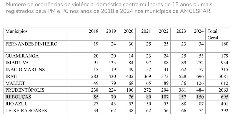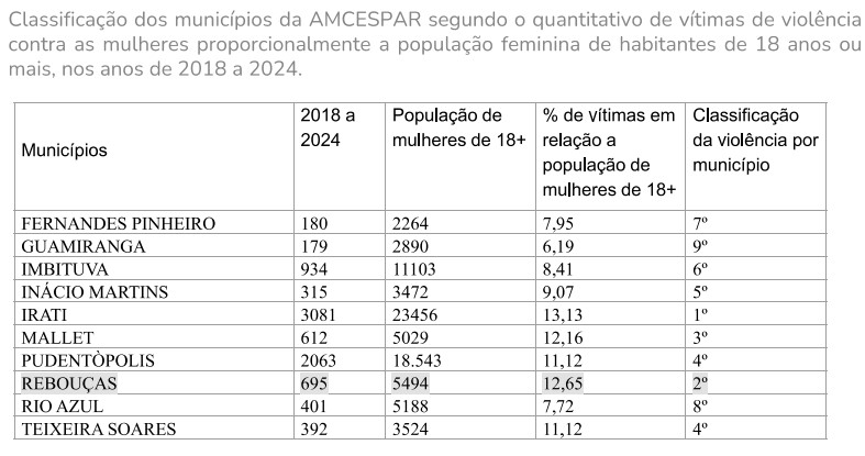 Violência doméstica – Irati e Rebouças lideram ranking proporcional de casos registrados entre 2018 e 2024 Por CLAYTON BURGATH Postado em 27 de agosto de 2025 0 imagem ilustrativa Índices alarmantes atingem todos os municípios da AMCESPAR por: Clayton Burgath-jornalista O levantamento sobre ocorrências de violência doméstica contra mulheres maiores de 18 anos, registrado pela Polícia Militar e Polícia Civil nos municípios da AMCESPAR entre 2018 e 2024, revela números preocupantes. No período, foram contabilizadas milhares de ocorrências, demonstrando que o problema persiste em ritmo elevado na região. Irati aparece no topo da lista absoluta, com 3.081 casos, seguido por Prudentópolis, com 2.063 registros. No entanto, quando analisado o índice proporcional à população feminina com 18 anos ou mais, o cenário se torna ainda mais preocupante. Irati lidera o ranking, com 13,13% da população feminina vítima de violência, enquanto Rebouças ocupa a segunda posição, com 12,65%. Esses percentuais indicam que, a cada 100 mulheres adultas residentes nessas cidades, aproximadamente 13 e 12, respectivamente, sofreram algum tipo de violência doméstica nos últimos seis anos. (gráfico ao final do texto) Por outro lado, o menor índice proporcional foi registrado em Guamiranga, com 6,19%, indicando que, apesar da gravidade, a situação é menos crítica em comparação com outras localidades da região. Outros municípios também chamam atenção, como Mallet (12,16%) e Teixeira Soares (11,12%). Os dados abaixo, são resultado de estudos realizados pela cientista política e pesquisadora na área de gênero e política, Professora Dra. Alexandra Lourenço. Esses dados reforçam a importância da campanha Agosto Lilás, que busca conscientizar a sociedade sobre a violência contra a mulher e incentivar denúncias. A iniciativa é fundamental para promover políticas públicas efetivas, fortalecer a rede de proteção e garantir que mais mulheres encontrem segurança e apoio para romper o ciclo da violência.